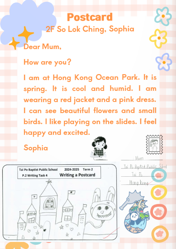 不論是明信片的簡單問候、對生活細節的描寫,還是故事中的情感流露,每一篇作文都記錄了同學們在學習路上的點滴成長。這群 P.2 與 P.3 的小小作家,正透過流暢的英文筆觸,一步步地表達自我。
