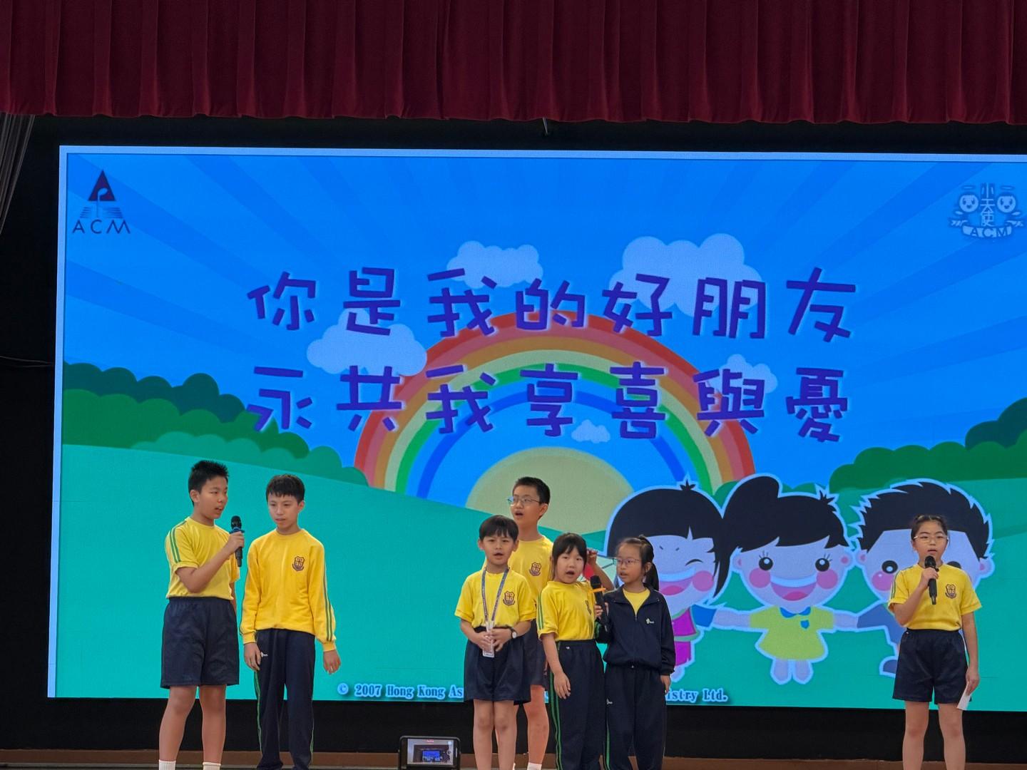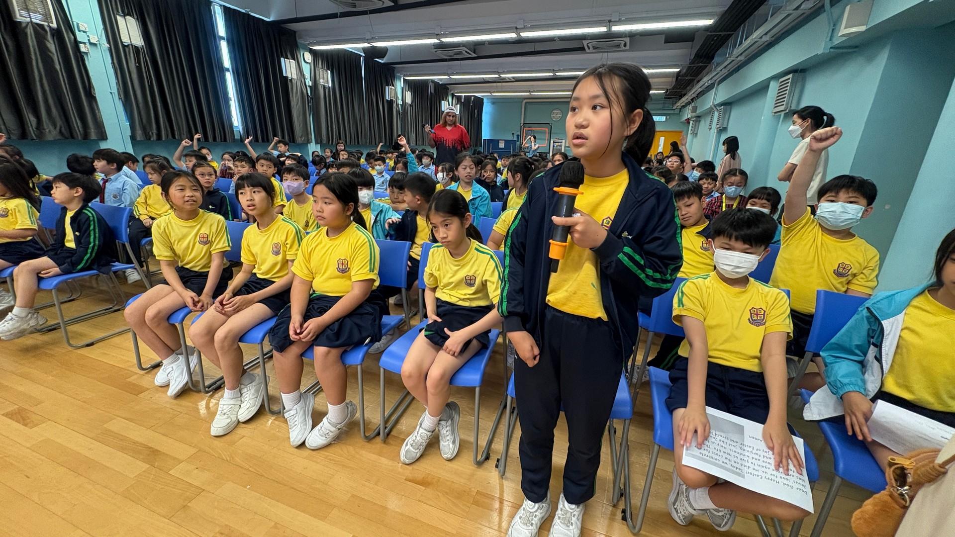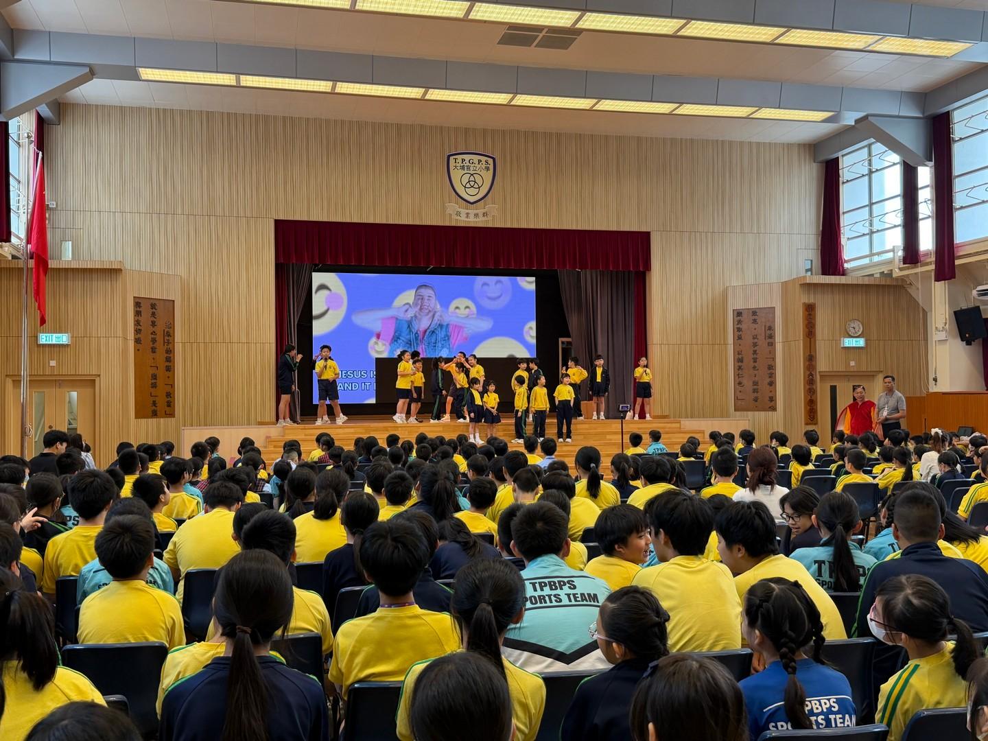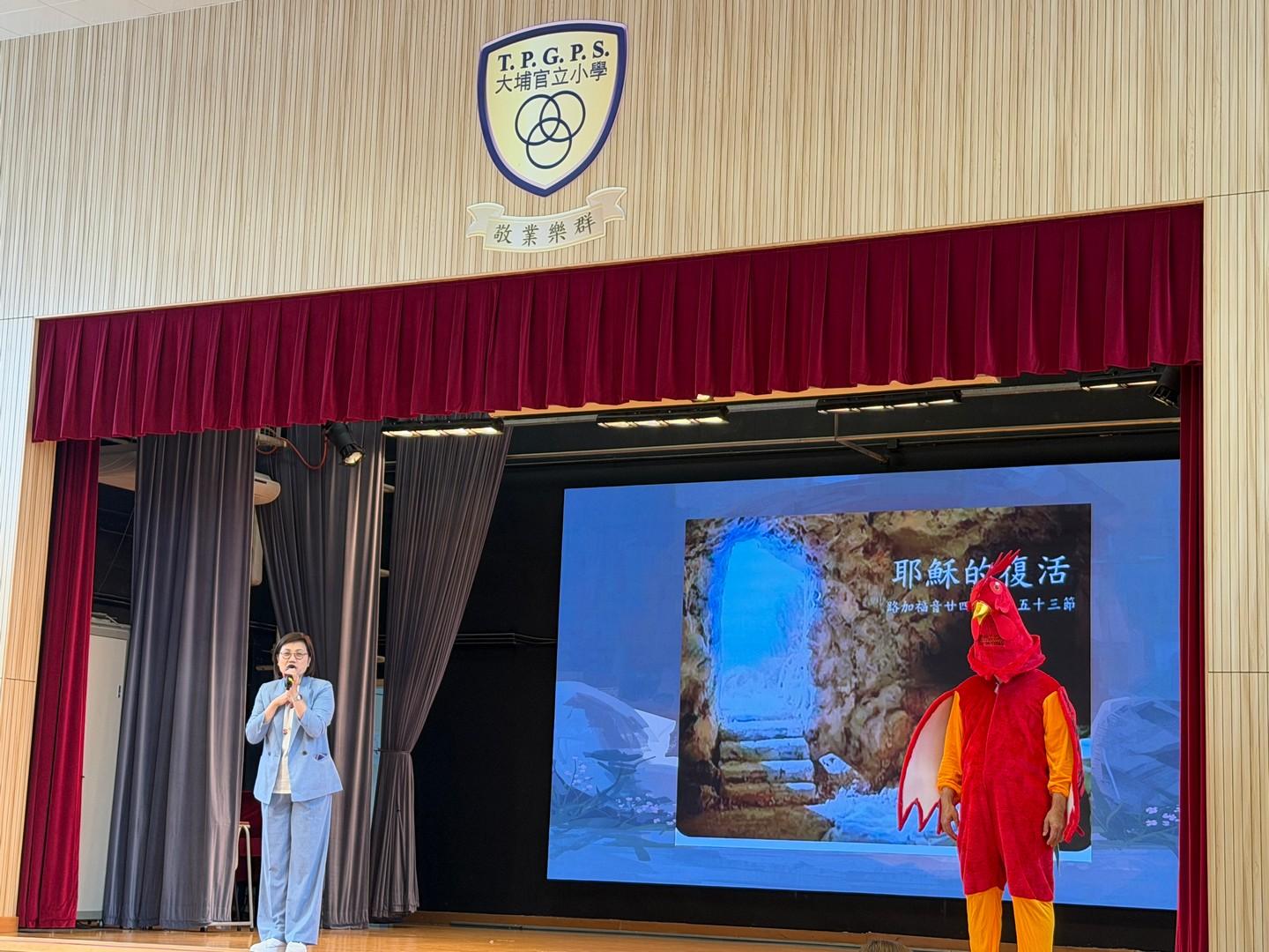 * 驚喜話劇與詩歌:崇拜中,潮牧師和同學們穿上鮮紅雞寶寶服飾,生動演繹《路加福音》24章的聖經故事,以及遇見復活主的喜悅,全場更齊聲合唱〈你是我的好朋友〉,二愛和二德班更獻唱詩歌All  things bright and beautiful,歌聲響徹禮堂。